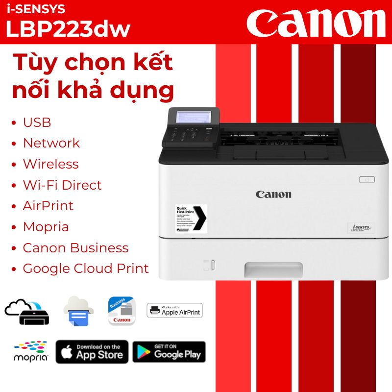 Máy in Canon i-SENSYS LBP223dw là giải pháp in laser đơn sắc hiệu suất cao được thiết kế đặc biệt cho văn phòng nhỏ và trung bình. Với tốc độ in lên đến 33 trang/phút và khả năng in 2 mặt tự động hoàn toàn, thiết bị này mang đến hiệu quả làm việc vượt trội cùng chi phí vận hành tối ưu cho doanh nghiệp Việt Nam.
