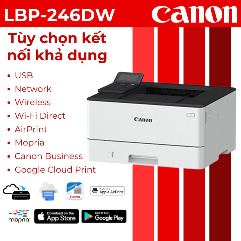 Máy in đen trắng Canon 246dw tích hợp đầy đủ các tùy chọn kết nối hiện đại. Wi-Fi 802.11a/b/g/n và Wi-Fi Direct cho phép in từ smartphone, tablet một cách dễ dàng thông qua Canon PRINT Business, AirPrintMopria.