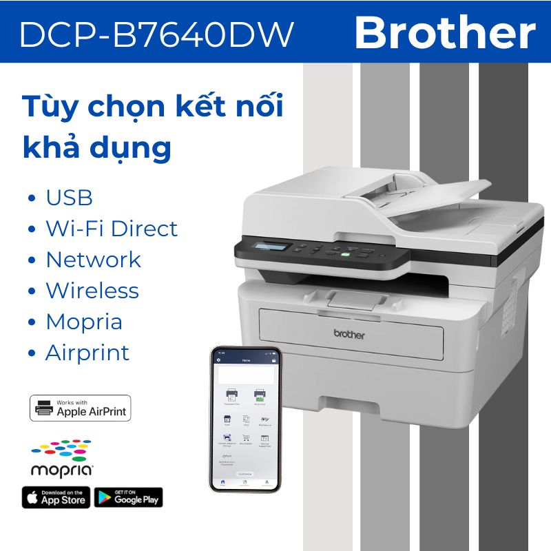 Máy in laser Brother DCPB7640DW tích hợp công nghệ Wi-Fi 2.4GHzWi-Fi Direct cho phép kết nối trực tiếp từ smartphone và tablet mà không cần router. Cổng USB 2.0Ethernet đảm bảo tính ổn định cho môi trường văn phòng đông người dùng.
