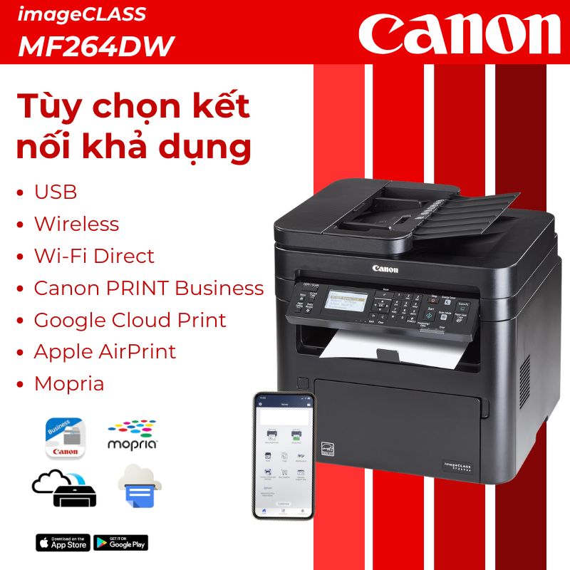 Canon MF264dw in không dây hỗ trợ Wi-Fi 802.11 b/g/nWi-Fi Direct, cho phép kết nối trực tiếp với smartphone, tablet mà không cần router. Ứng dụng Canon PRINT Business, AirPrintGoogle Cloud Print đảm bảo tương thích hoàn hảo với các thiết bị iOS và Android.