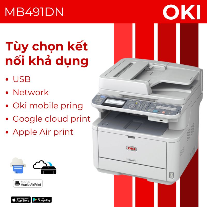 OKI Multifunction MB491DN hỗ trợ đa dạng phương thức kết nối bao gồm USB 2.0, Ethernet và tùy chọn WiFi. Tính năng in trực tiếp từ USB cho phép in tài liệu mà không cần kết nối máy tính, tiết kiệm thời gian và tăng tính bảo mật.