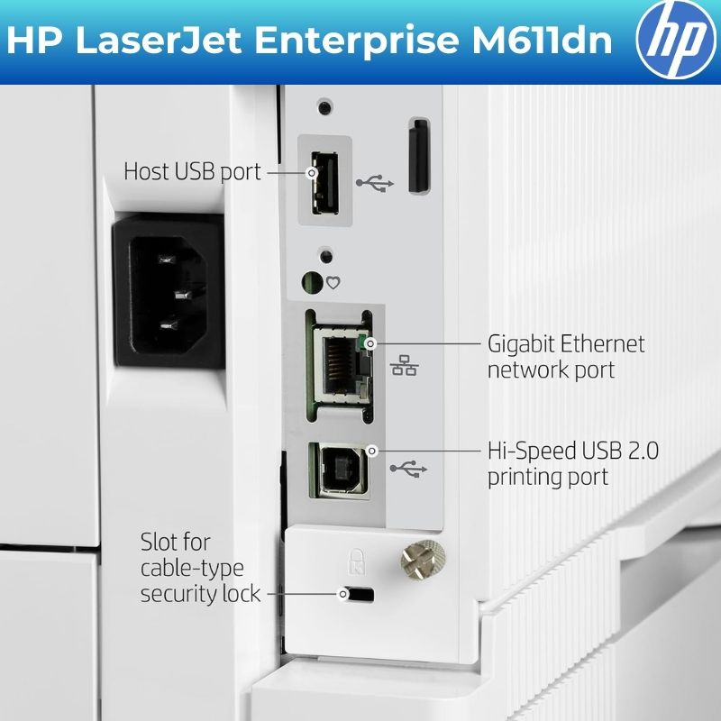 HP M611DN Enterprise hỗ trợ đầy đủ các chuẩn kết nối hiện đại bao gồm AirPrint, Google Cloud Print 2.0, Mopria và ứng dụng HP Smart. Kết nối qua cổng LAN RJ45, USB 2.0 và Wi-Fi Direct (qua module tùy chọn) đáp ứng mọi nhu cầu in từ máy tính, laptop đến điện thoại thông minh.