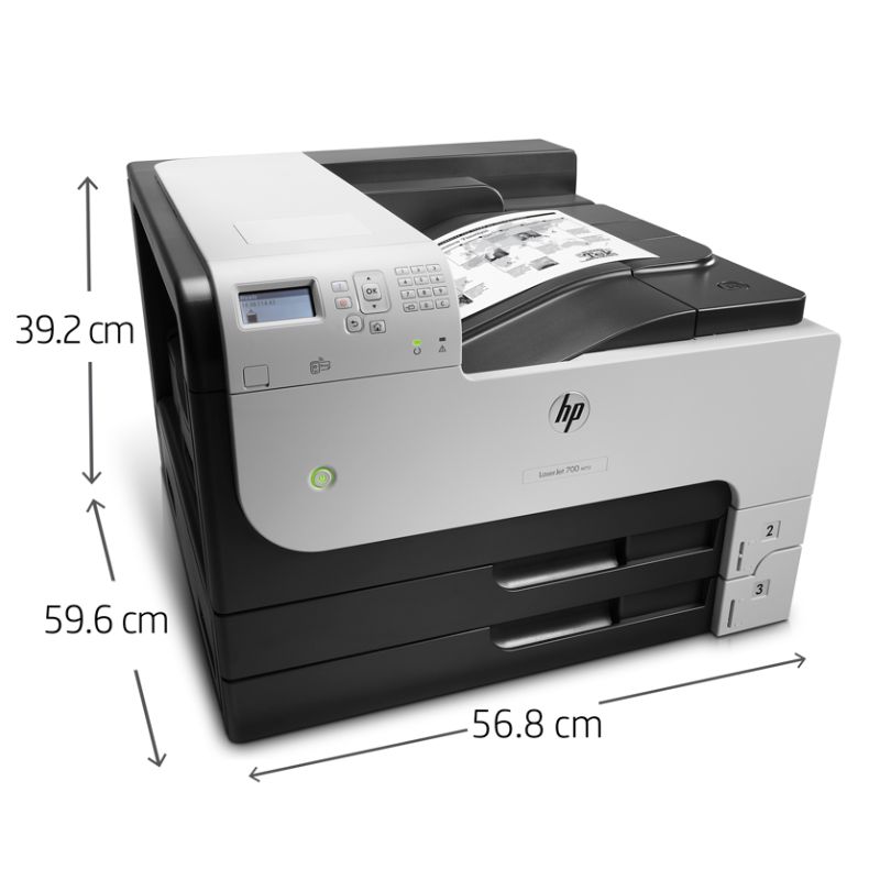 Với kích thước 39.2 x 56.8 x 59.6 cm và trọng lượng 38.5 kg, HP LaserJet 700 M712dn có thiết kế gọn gàng phù hợp với không gian văn phòng hạn chế. Chứng nhận EPEAT Silver khẳng định cam kết bảo vệ môi trường của HP.