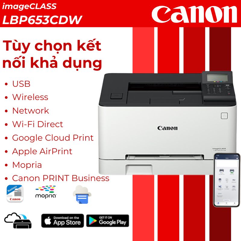 Máy in laser màu Canon 653cdw tích hợp đầy đủ các tùy chọn kết nối hiện đại. Kết nối Wi-Fi 802.11b/g/n và Wi-Fi Direct cho phép in trực tiếp từ smartphone và tablet mà không cần router. Cổng Ethernet 10/100/1000Base-T đảm bảo kết nối mạng ổn định cho môi trường văn phòng.