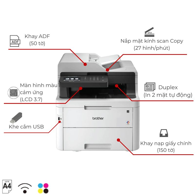 Máy in Brother MFC-L3750CDW là giải pháp in ấn đa chức năng 4 trong 1 hoàn hảo cho văn phòng tại gia và doanh nghiệp nhỏ. Với công nghệ LED màu tiên tiến và màn hình cảm ứng 9.3cm trực quan, thiết bị này mang đến hiệu suất vượt trội cùng khả năng tiết kiệm chi phí vận hành đáng kể.