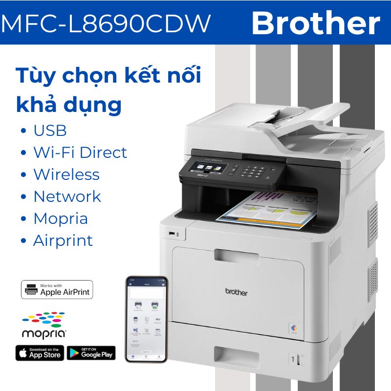 Máy in đa năng Brother MFC-L8690 tích hợp Wi-Fi 802.11b/g/n cùng cổng Gigabit Ethernet đảm bảo kết nối ổn định trong mọi môi trường mạng. Hỗ trợ in di động qua AirPrint, Google Cloud Print và Mopria cho phép in trực tiếp từ smartphone và tablet một cách tiện lợi.