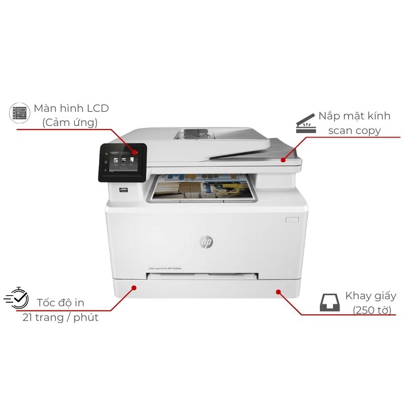 Máy in văn phòng HP M282 tích hợp khay nạp tài liệu tự động 50 tờ, cho phép scan và copy hàng loạt mà không cần can thiệp thủ công. Tốc độ sao chép 21 bản/phút đảm bảo hiệu suất làm việc ổn định cho mọi tác vụ.