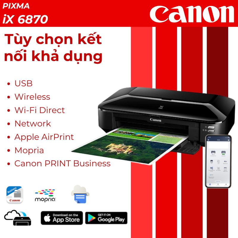 Máy in Canon WiFi iX6870 tích hợp đầy đủ tùy chọn kết nối hiện đại. Kết nối Wi-Fi 802.11b/g/n cho phép in không dây từ máy tính, laptop và thiết bị di động. Ứng dụng Canon PRINT hỗ trợ in trực tiếp từ smartphone Android 5.0+ và iOS 15/16, trong khi AirPrint tương thích hoàn hảo với hệ sinh thái Apple.