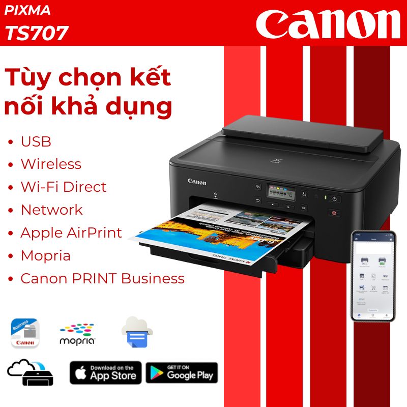 Máy in văn phòng Canon TS707 tích hợp đầy đủ các tùy chọn kết nối hiện đại với Wi-Fi 802.11b/g/n, AirPrint, Google Cloud Print và Mopria. Người dùng có thể dễ dàng in từ điện thoại thông qua ứng dụng Canon PRINT Inkjet/SELPHY hoặc kết nối trực tiếp qua cổng USB 2.0.