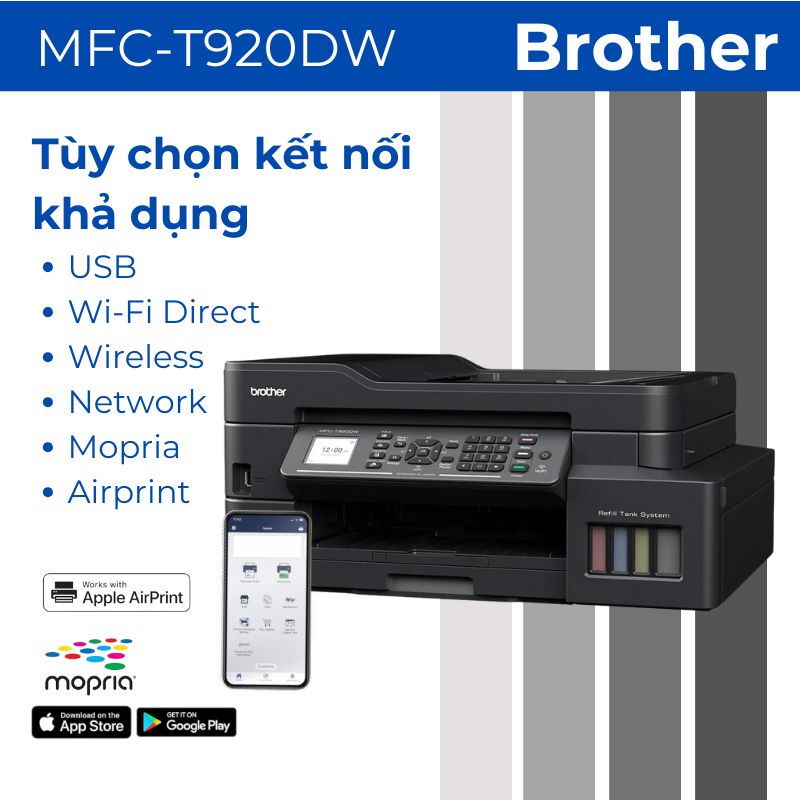 Brother T920DW WiFi hỗ trợ kết nối Wi-Fi 802.11b/g/n cùng khả năng in từ di động qua AirPrint và Mopria. Người dùng có thể in trực tiếp từ smartphone, tablet mà không cần cài đặt phức tạp.