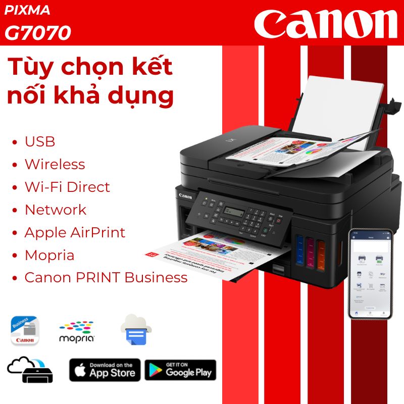 Canon G7070 bình mực lớn hỗ trợ đa dạng phương thức kết nối bao gồm Wi-Fi 802.11b/g/n, USB 2.0 và Ethernet. Tính năng AirPrint và Mopria cho phép in trực tiếp từ smartphone và tablet. Ứng dụng Canon PRINT hỗ trợ đầy đủ trên iOS và Android, mang đến trải nghiệm in ấn linh hoạt mọi lúc mọi nơi.