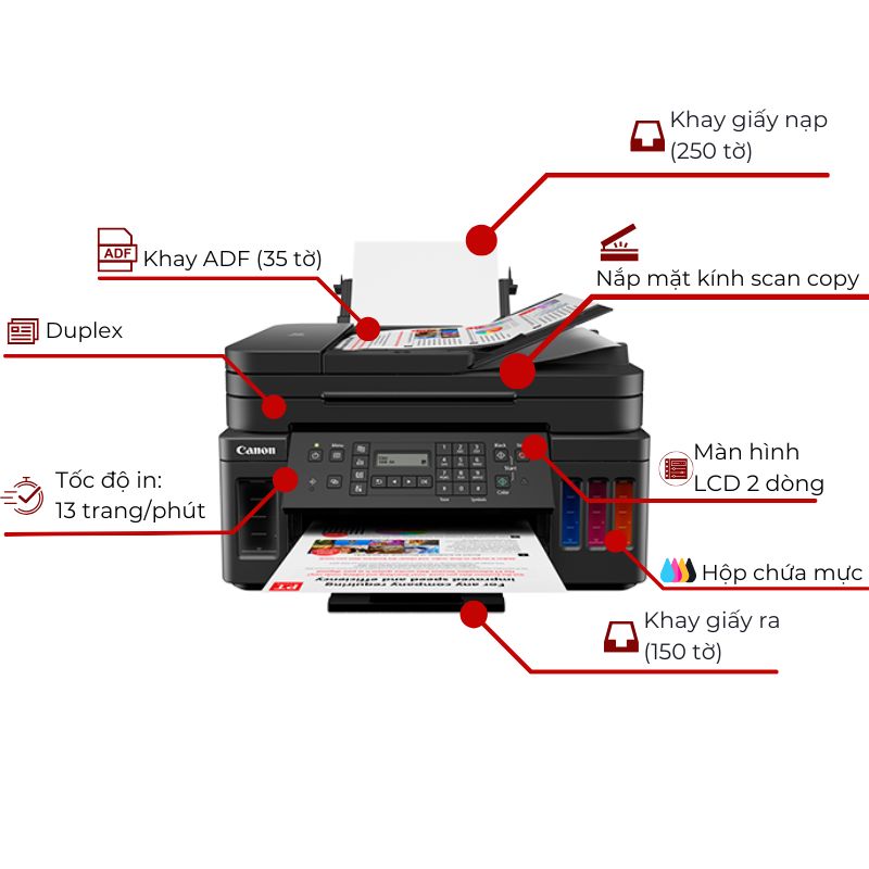 Canon G7070 đa năng sở hữu tốc độ in ấn tượng với 13 trang/phút cho tài liệu đen trắng và 6.8 trang/phút cho in màu. Độ phân giải 4800×1200 dpi đảm bảo chất lượng in sắc nét cho cả văn bản và hình ảnh. Thời gian in trang đầu tiên chỉ 9 giây cho đen trắng và 14 giây cho màu, giúp tối ưu hóa thời gian làm việc.