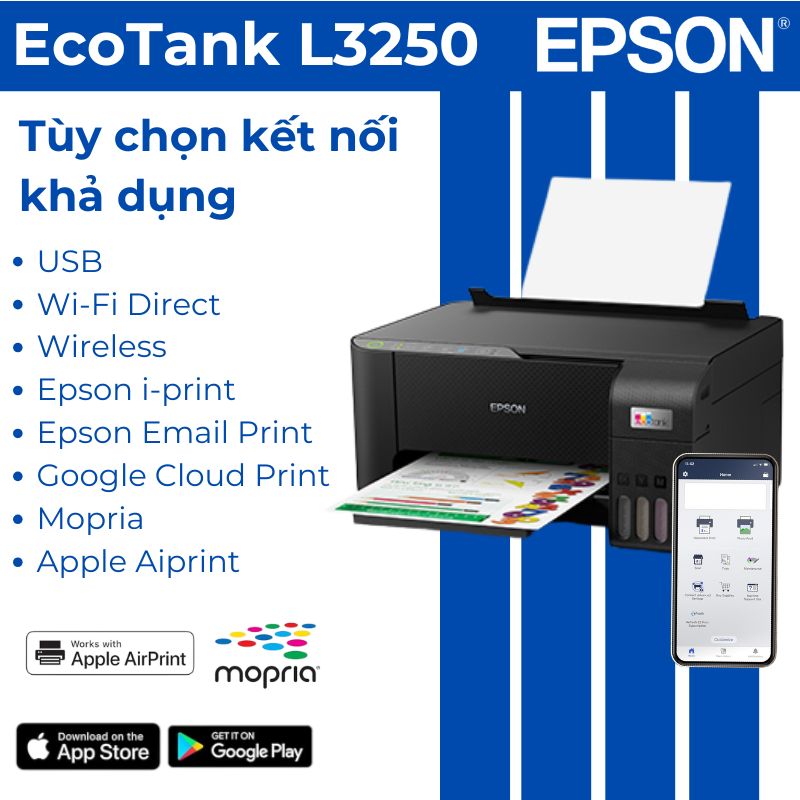 Máy in không dây Epson L3250 hỗ trợ kết nối Wi-Fi 802.11b/g/n và Wi-Fi Direct, cho phép in trực tiếp từ smartphone, tablet mà không cần router. Ứng dụng Epson Smart Panel giúp bạn điều khiển máy in, quét tài liệu và theo dõi mực một cách tiện lợi.